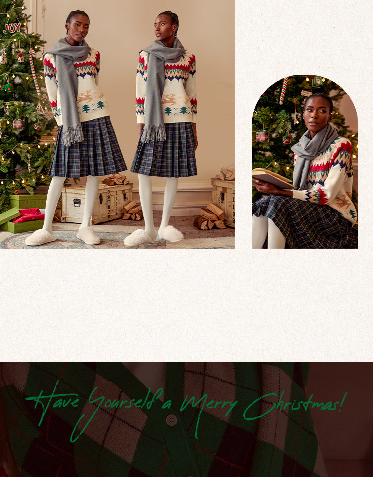 Bring the warmth this Christmas season in jolly layered looks. Wrap yourself in sumptuous scarves, vibrant sweaters, and plush skirts over tights. Whether you’re staying cozy at home and slipping into warm fuzzy slippers or stepping into boots to head out, let your knitted layers be heavy but your heart be light.