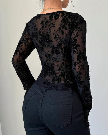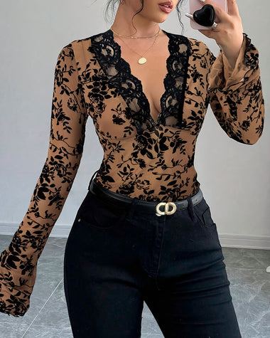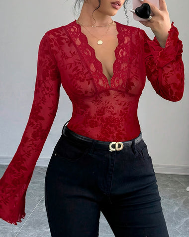 Sexy Floral Lace Bell Sleeve V Neck Top