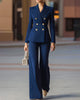 • Top: Long sleeves, double-breasted button closure, lapel collar