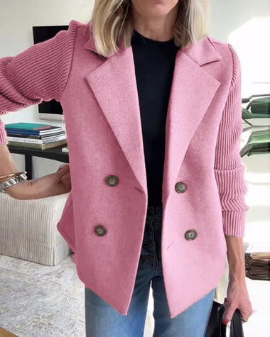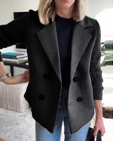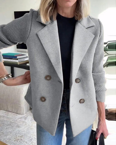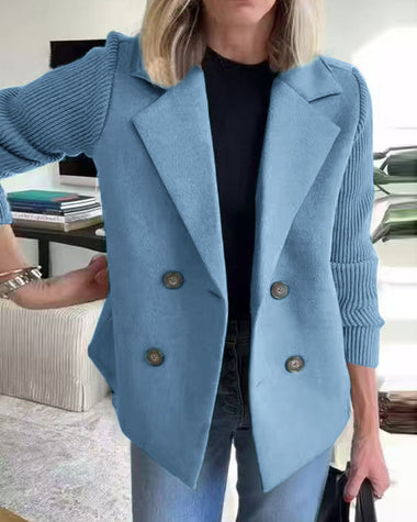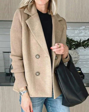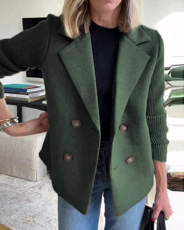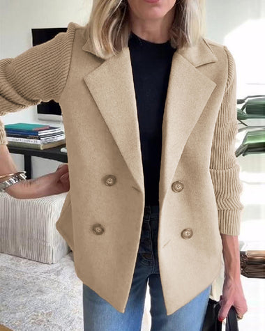 • Design: Double-breasted button closure, lapel collar, knit patchwork sleeves