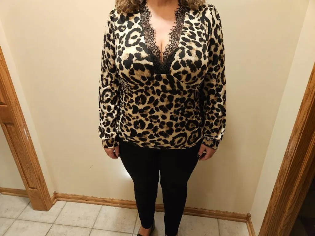 I don't normally wear low cut v-necks like this, but I really do like it, especially with the lace! My husband absolutely loves the look of this top and how the size perfectly contours my curves! And of course, I love the color and anything with leopard print. The top appears to be high quality made and with solid craftsmanship! The fabric itself is very soft and stretches to match my curves. I'm normally an average XL with a bigger bust, but after checking the size chart, I decided to go with an XXL and it worked out perfect! Overall, I think based on the quality, look, and price point of this top, I would highly recommend! Pretty good value in my book!