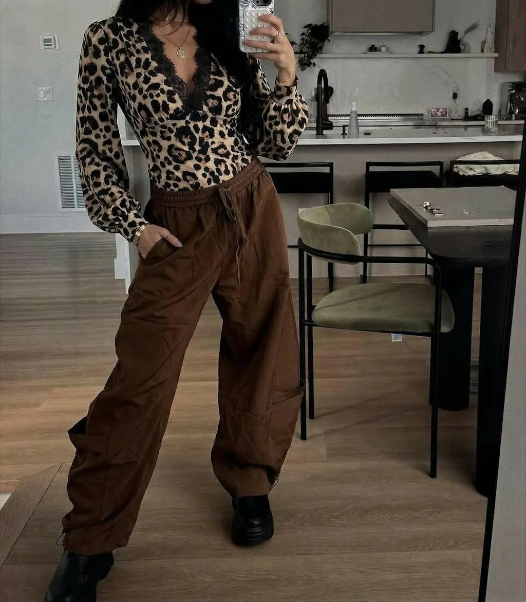 - Design: Leopard print, lace neckline