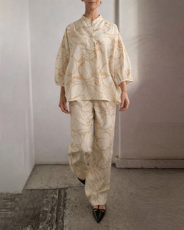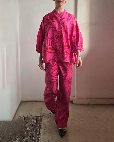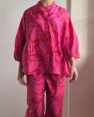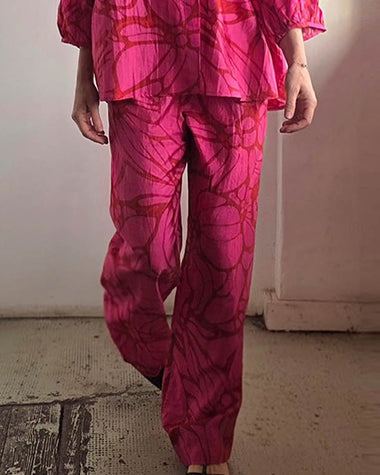 Summer Casual Print Linen Blend Blouse Pants Set
