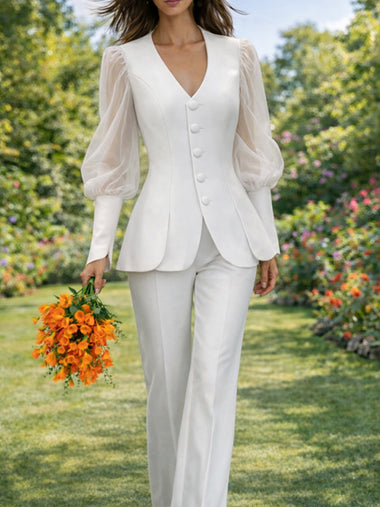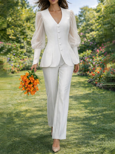 Chic Sheer Puff Sleeve Blouse Pants Suit Set