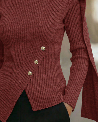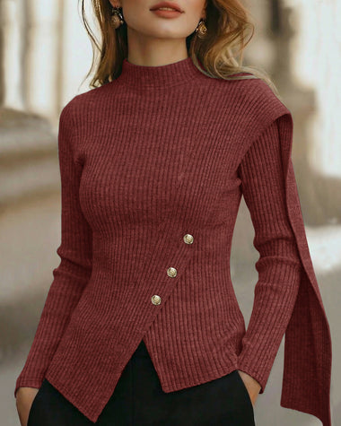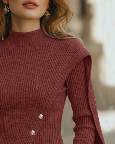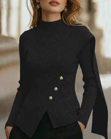 Elegant Mock Neck Button Accent Slit Hem Knit Top