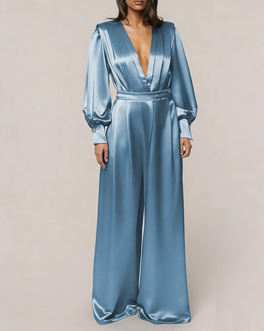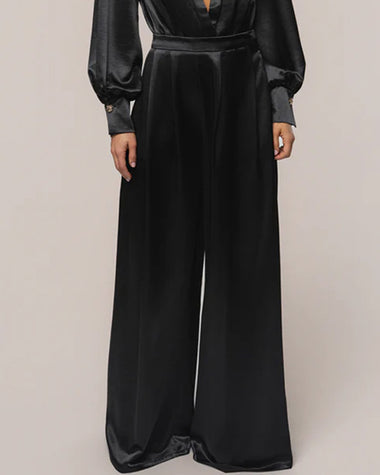 Elegant Satin Puff Sleeves Blouse Wide Leg Pants Set