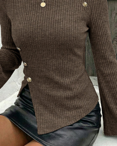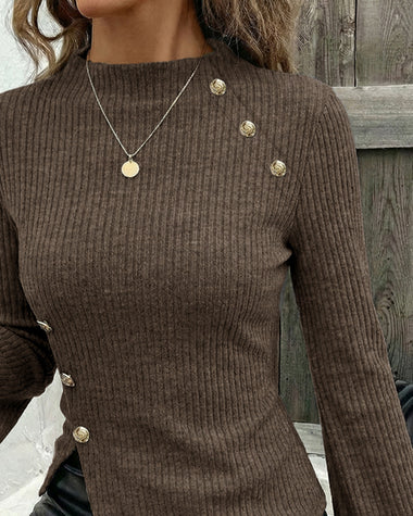 • Features: Elastic knit fabric, flare sleeve, crew neck, side slit, button accents