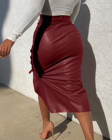 High Waist Side Split PU Midi Skirt