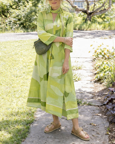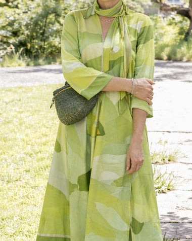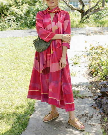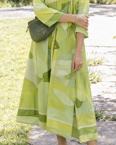 - Design: A-line silhouette, three-quarter sleeves, front slit