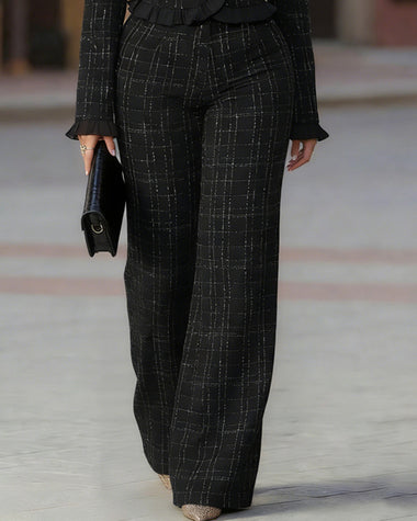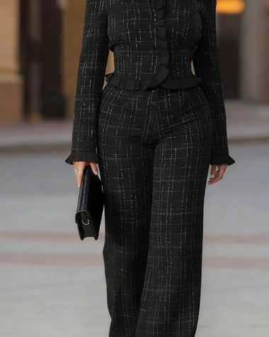 Stylish Ruffle Trim Tweed Top and Pants Set