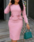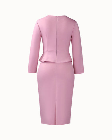 • Features: Pencil dress, long sleeves, round neck, 3D floral design, ruffle trim, back slit