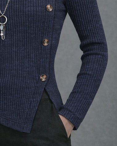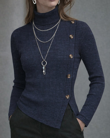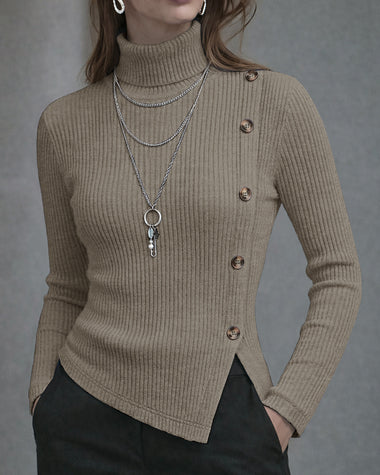 Elegant Button Accent Elastic Knit Turtleneck Top