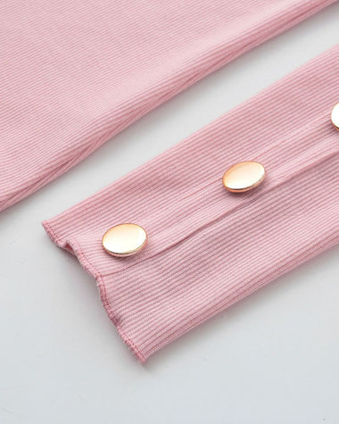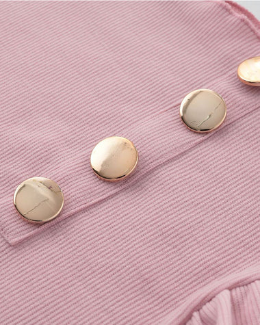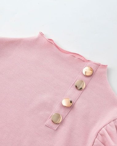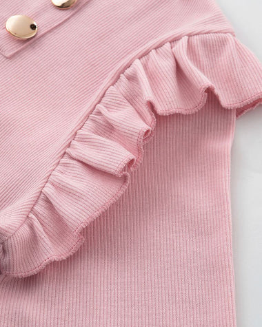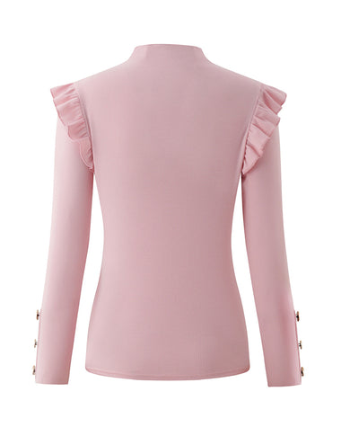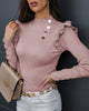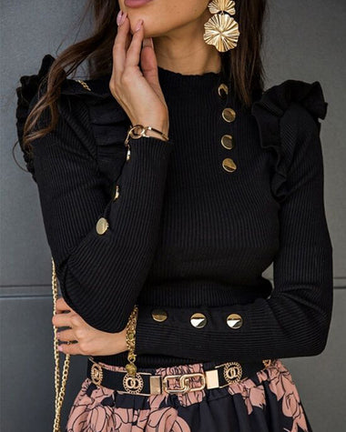 Elegant Ruffle Trim Button Detail Rib Blouse