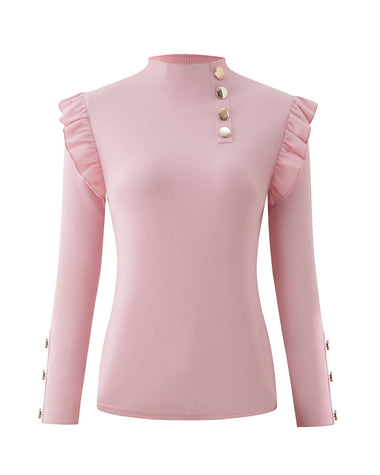• Features: Long sleeve, turtleneck, ruffle trim, button accents