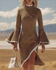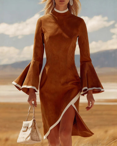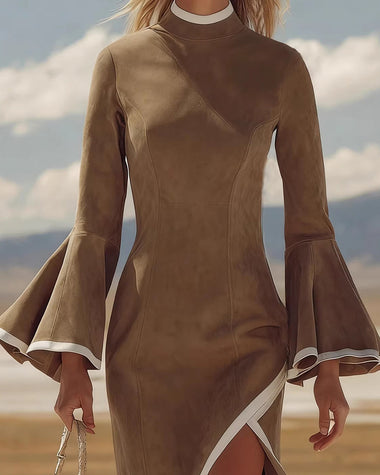 Elegant Suede Flared Sleeves Midi Dress