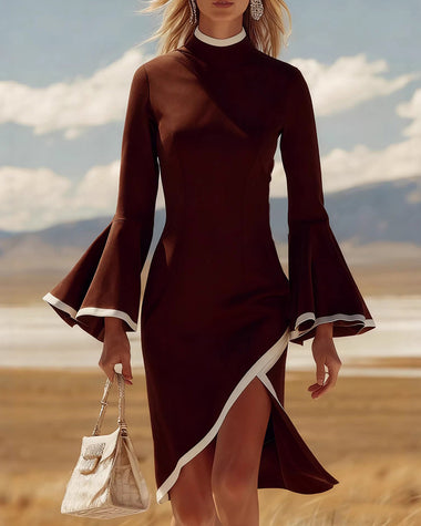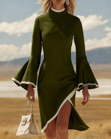 • Design: Flared sleeves, turtleneck, contrast color trim, side slit