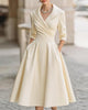 • Design: Oversized lapel collar with V-neck opening, cinched waist, A-line silhouette, mid-calf length, hidden side zipper closure, adjustable collar styling, practical side pockets