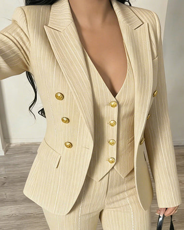• Blazer: Peak lapel, double-breasted, gold metal buttons, shoulder pads