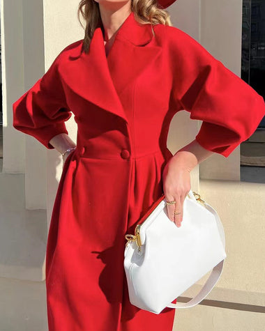 • Features: Oversized lapel collar, lantern sleeves, waist-cinching design