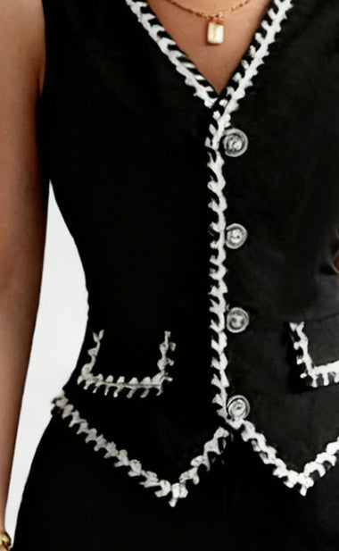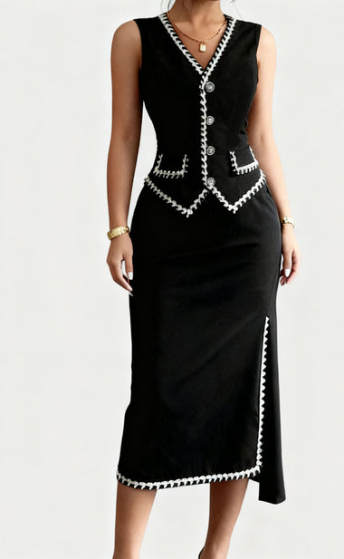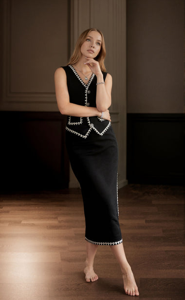 Luxury Contrast Trim Vest Bodycon Skirt Suit