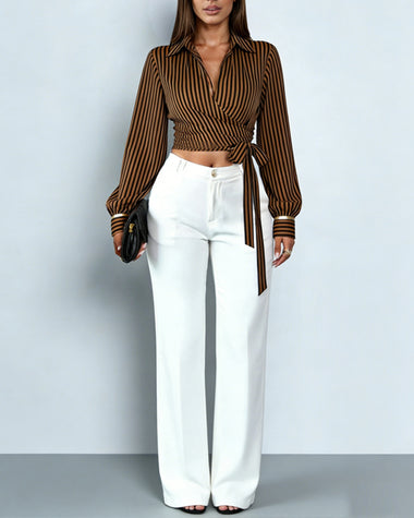 Stylish Striped Long Sleeve Wrap Crop Top