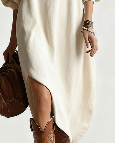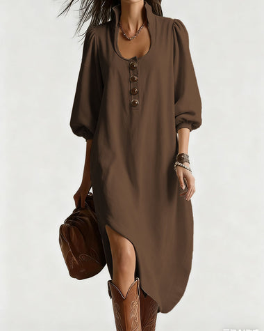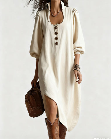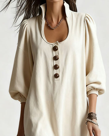 • Design: Lantern sleeves, stand collar, slit hem, 4 decorative buttons