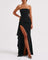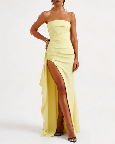 • Details: Strapless neckline, irregular hem, thigh-high side slit, slim fit cinched-waist silhouette.
