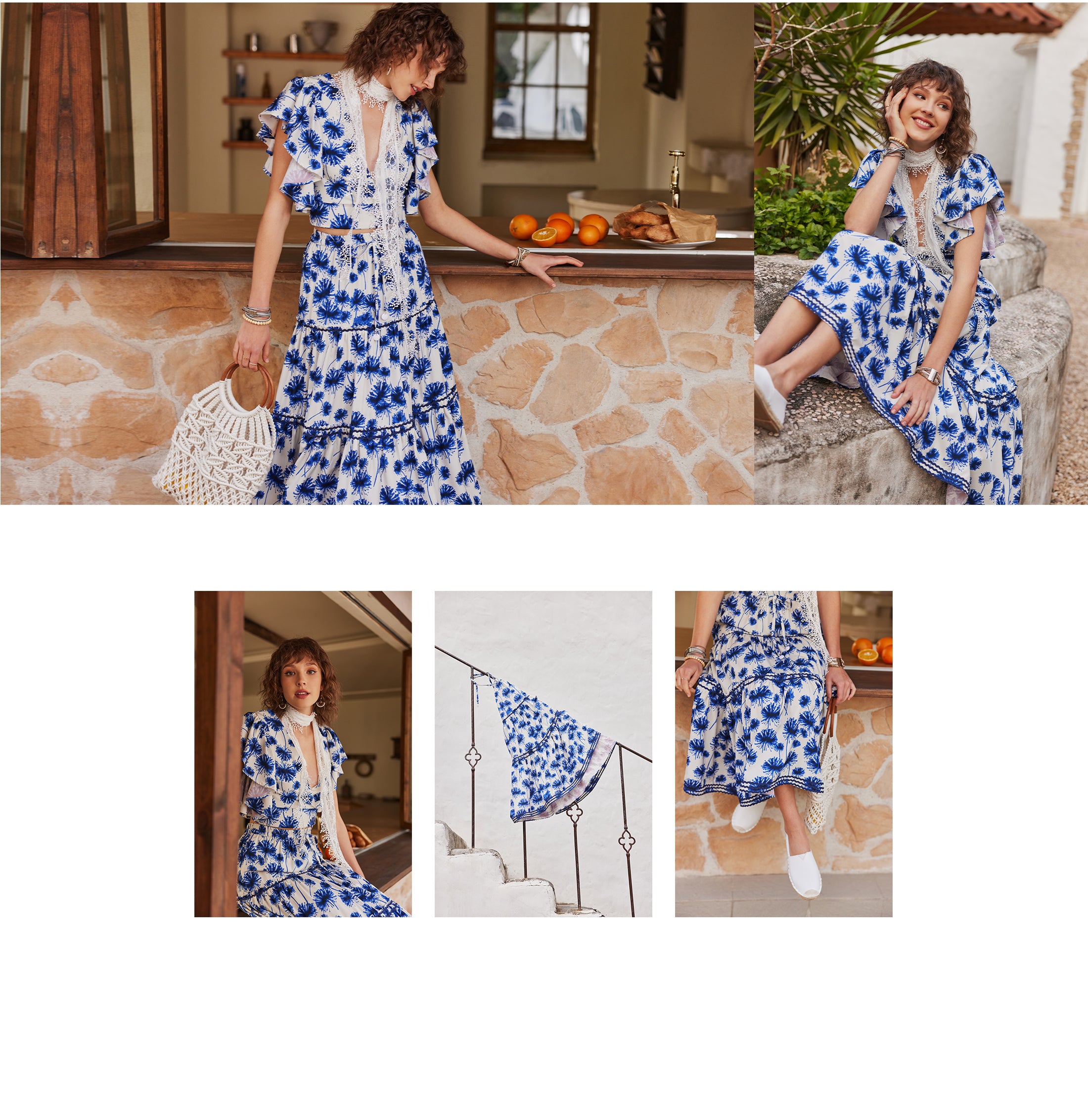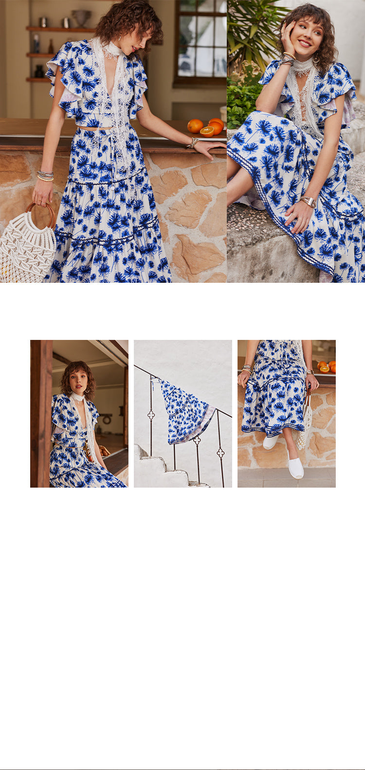 There’s no feeling blue in a blue and white floral print ensemble. A matching blouse and skirt set delivers the dreamiest vacation vibe.