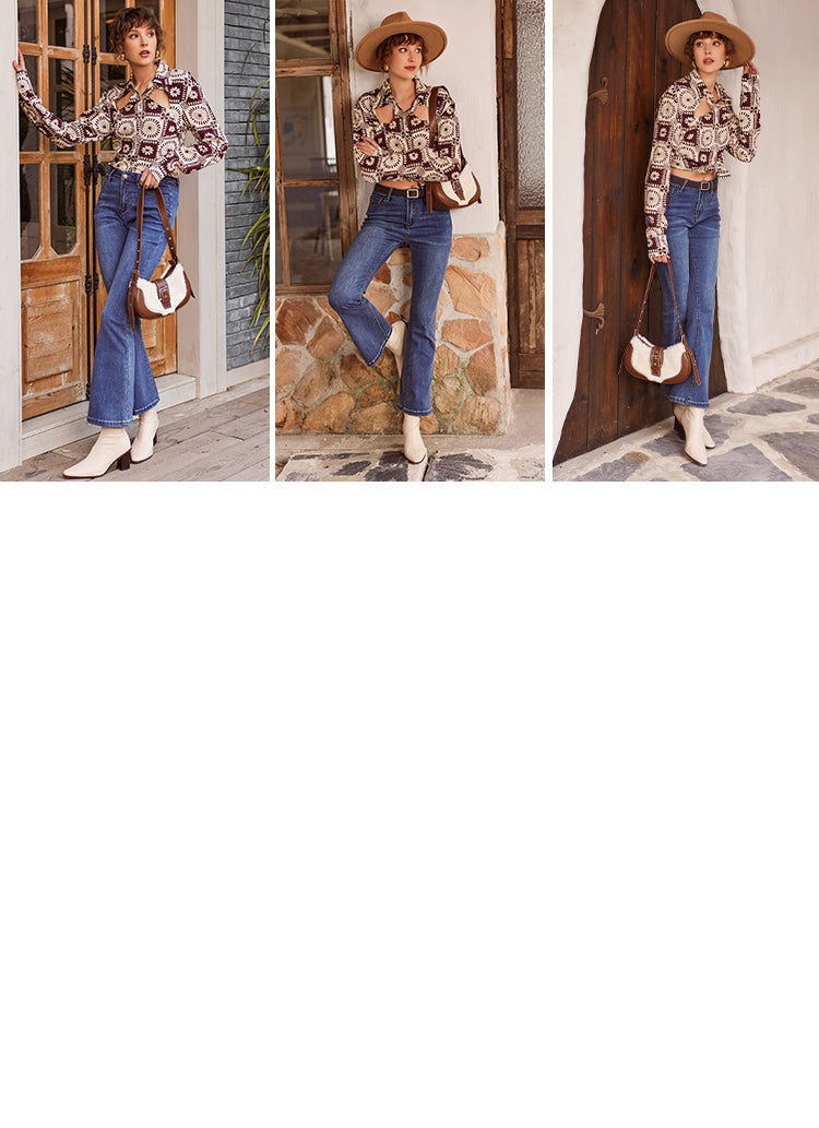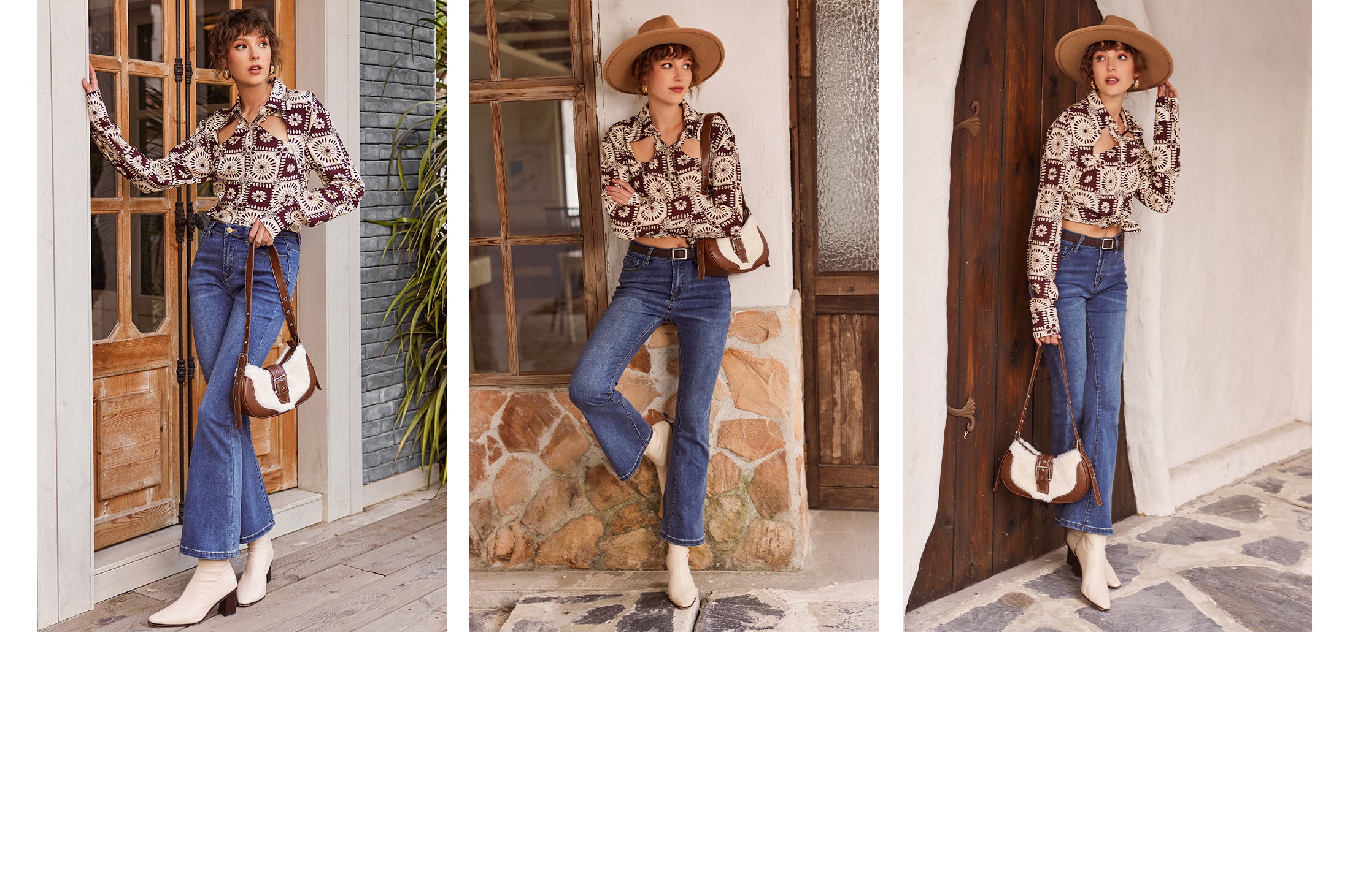 Let your style go on over drive wearing jeans that you just can’t go wrong with. Bring comfort, practicality, and fashion on your holiday with classic bootcut denims. Pair the jeans with a button down top that’s anything but classic, featuring a cropped silhouette, cutouts along the neckline and a retro floral print. A must-have for any type of holiday dressing, you must not forget to pack jeans and a statement top wherever you may go.