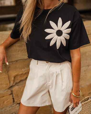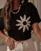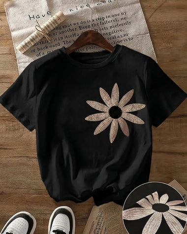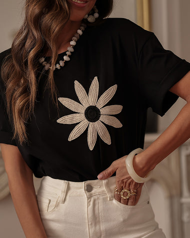 Fashion Contrast Color Flower Embroidery T-shirt