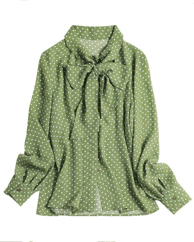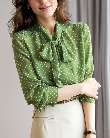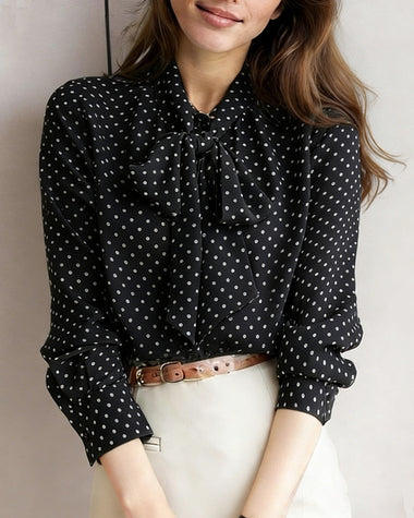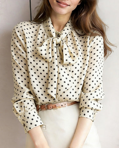 Polka Dot Print Bow Tie Neck Office Blouse