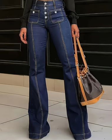 • Design: High waist, button fly, belt loops, flared pants design, pockets