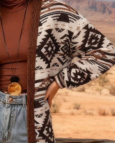 • Design: collarless, open front, geometric bohemian patterns