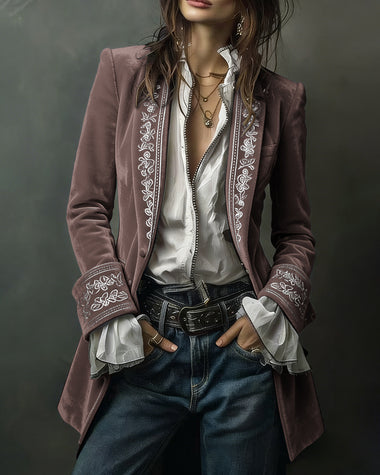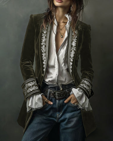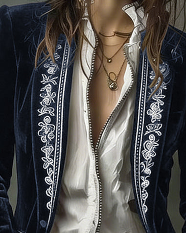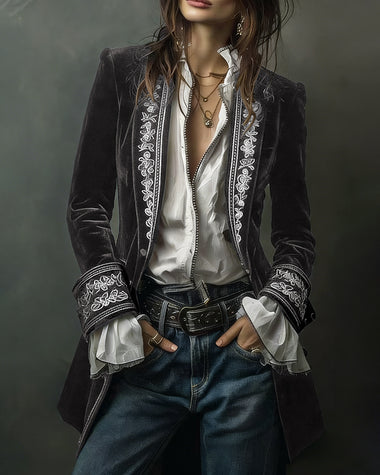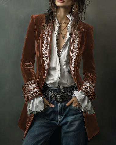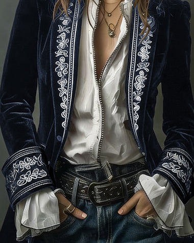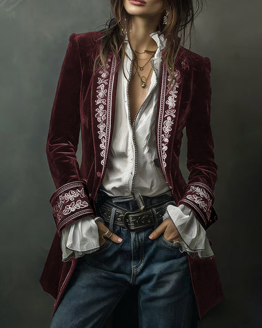 Court-Style Floral Embroidery Velvet Jacket Blazer