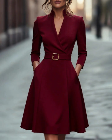 • Details: Long sleeves, stand collar, deep v-neck, waist belt, A-line design