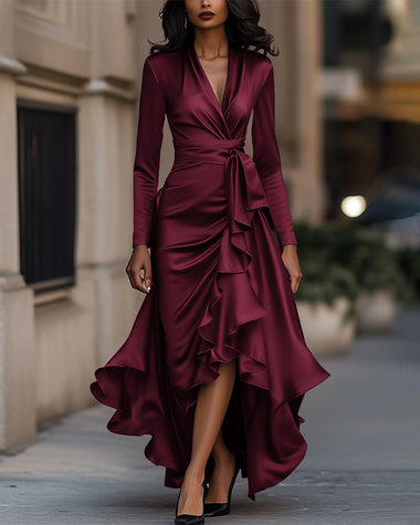 • Features: Long sleeves, v-neck, waisted belt, A-line design, ruffled hem