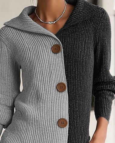 • Design: Shawl collar, asymmetric button closure, contrast color