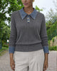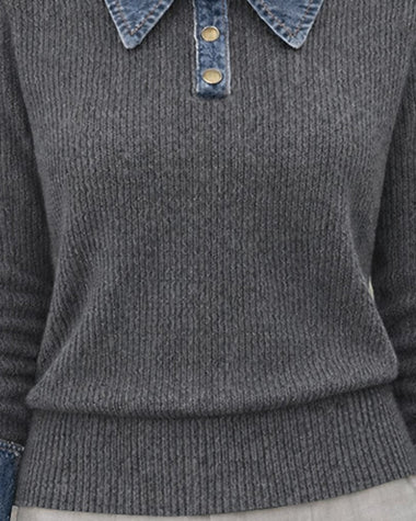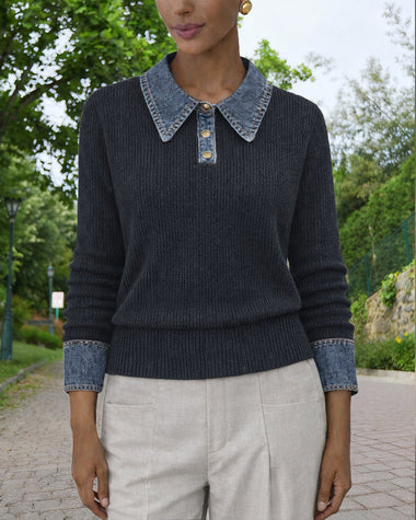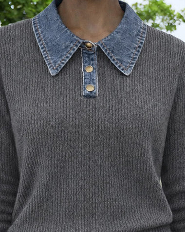 - Features: Long sleeves, lapel collar, denim patchwork collar and cuffs