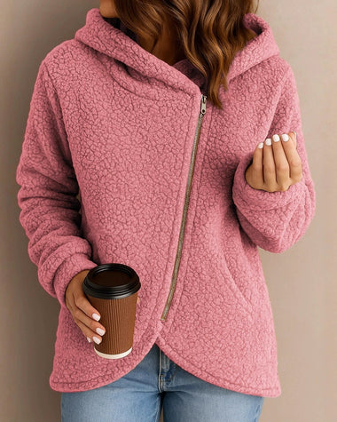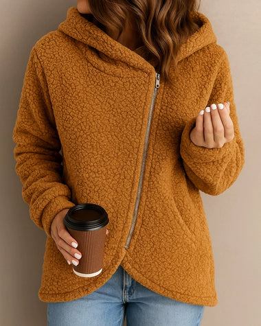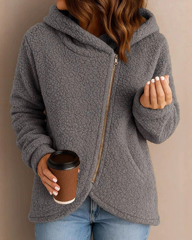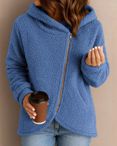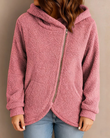 Casual Plush Fleece Diagonal Zip Hooded Jacket