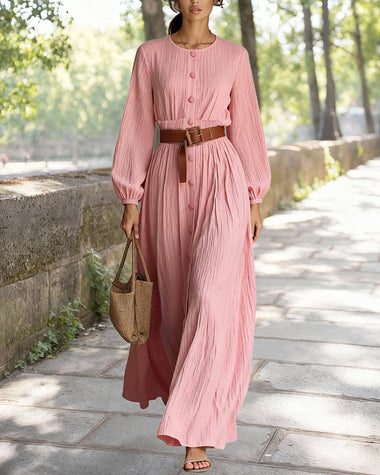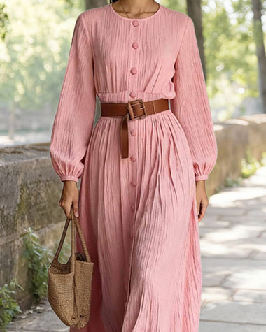 • Design: Long lantern sleeves, crew neck, waist-cinching design