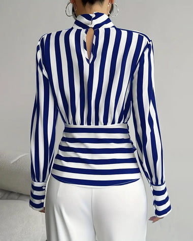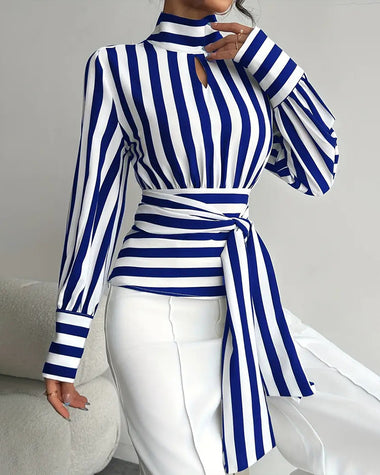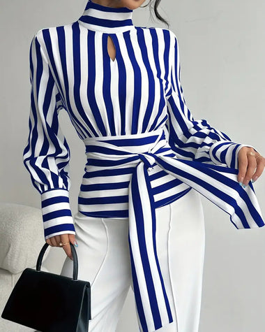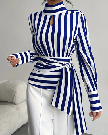 Chic Mock Neck Chuncky Stripe Belted Blouse
