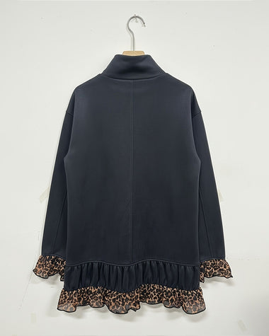 • Features: Long sleeves, leopard pattern patchwork cuffs and hem, suede fabric body, stand collar
